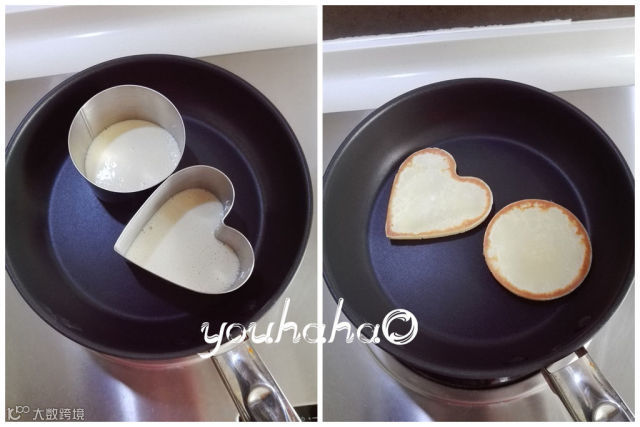 5. 平底不粘锅中放入模具,倒入面糊,小火烙成薄饼,两面烙黄即可,锅中不放油,依次煎好全部的面糊。