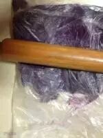 5 带上一次性手套将紫薯泥,糖粉,糯米粉揉匀成团,如果觉得干可以加适量牛奶调节,我没有加。盖上保鲜膜,醒5分钟左右。