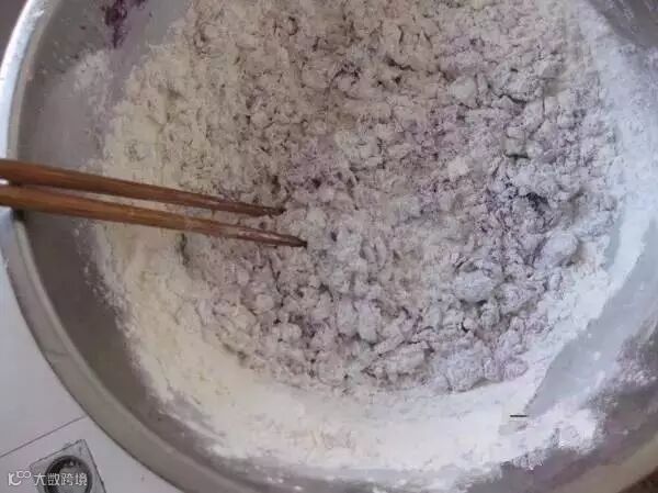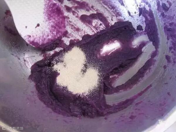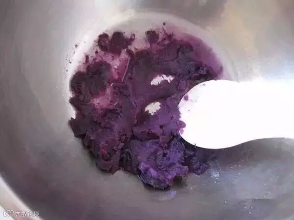 将紫薯提前蒸熟,加入清水里面压成泥糊状,或者用料理机打会更细腻。