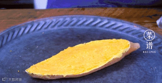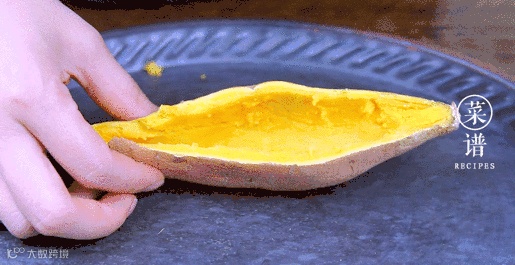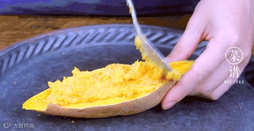 取出对半剖开,用勺子挖出红薯肉,