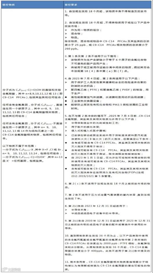 2020年8月3日,欧盟向WTO提交通报 G/ TBT/ N/EU/ 731,拟在欧盟REACH法规((EC) No 1907/2006)附录XVII中限制C9-C14 PFCAs。该法规草案正接受公众咨询,咨询期为通报发出后60天。该法规预计于2021年一季度被采纳,在欧盟官方公报上发布20天后生效。相关限制要求于法规生效18个月后实施。