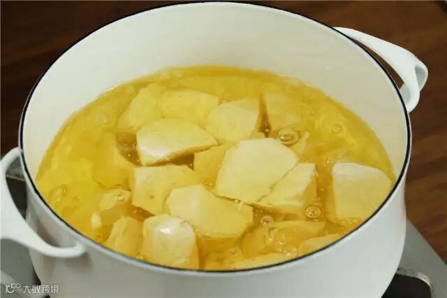 ▲油锅小火烧热到100度-120度,把手放在油锅的上方10厘米左右,感觉不到烫手,就可以把地瓜块下锅,保持小火,大概炸个8-10分钟。
