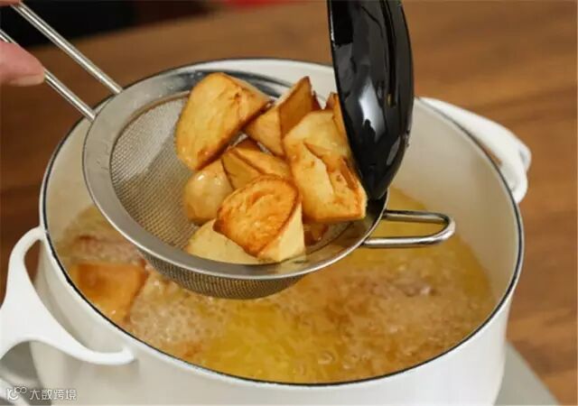 ▲地瓜差不多7、8成熟的样子,用筷子戳一下,可以戳透,但是能感觉到里面还有硬芯儿,就可以捞出来了,放在一边控油。