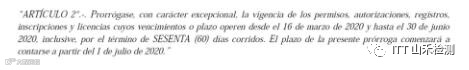 受COVID-19的重大影响,阿根廷ENACOM于5月21日再次发布公告461/2020,扩大了可延长60天有效期的证书范围,由原来的3月16日至5月16日,扩大为3月16日至6月30日。因此证书到期日为3月16日至6月30日之间的ENACOM证书,其有效期延长60天。