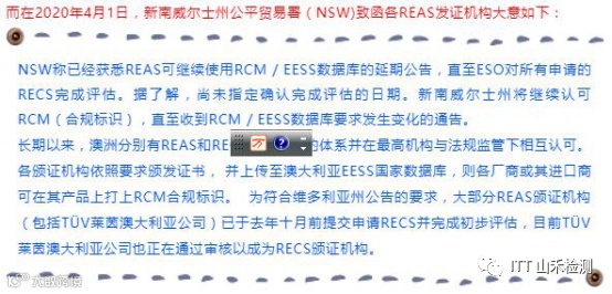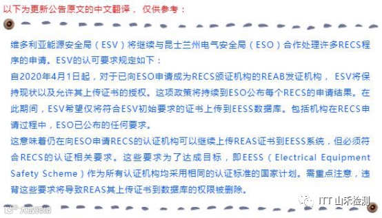 2020年3月30日, 澳大利亚的维多利亚州能源安全局(ESV)发布公告: 宣布该州将于2020年4月1日起, 继续接受REAS体系下所签发的电子产品安全证书。公告也称,已提交了RECS申请的认证机构,其颁发的REAS证书可以继续上传到EESS数据库直至另行通知。