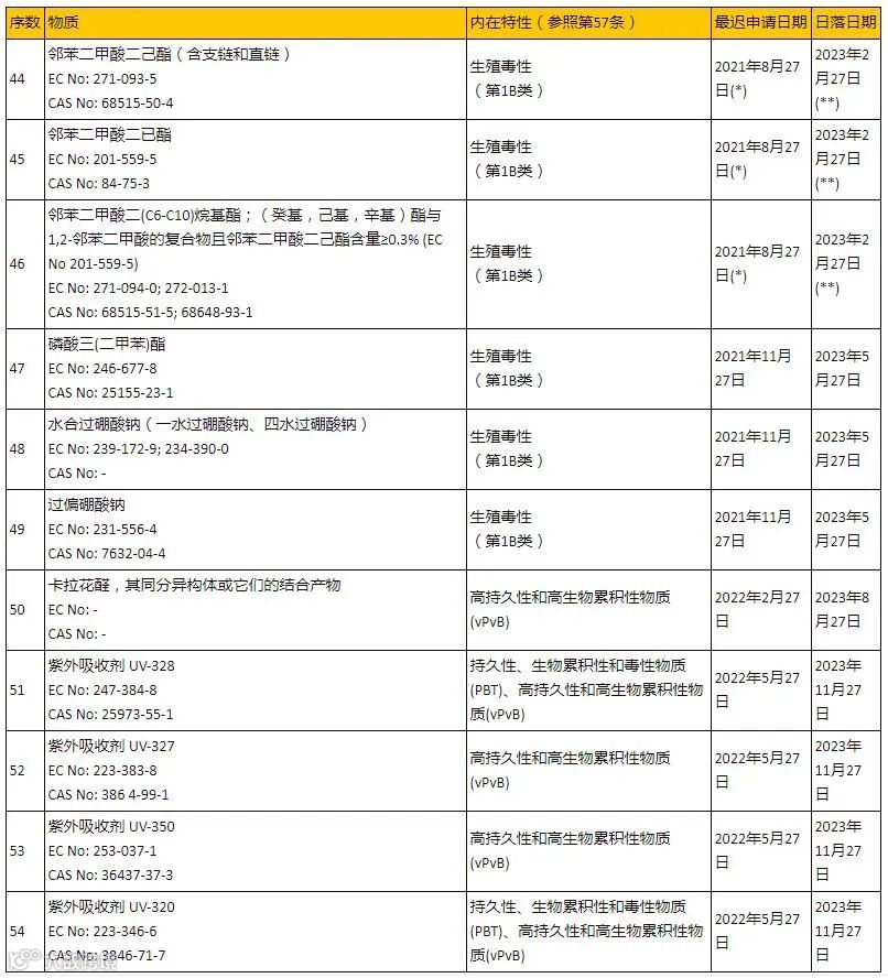 (*) 该日期为2021年9月1日 - 当该物质用于生产零配件,而零配件作为物品或复杂产品用于修复其他物品及复杂产品时,此类物品及复杂产品的生产已在或将在该物质的指定日落日期前停止。若没有该物质,零配件就不能生产,没有该零配件,这些物品或复杂产品就不能预期运作,则该物质可用于生产这些物品或复杂产品;若没有该些物质,物品或复杂产品就不能修复,且这些物品或复杂产品在生产时有用到该物质(单独使用或在混合物中),则该物质可以用于修复这些物品或复杂产品。