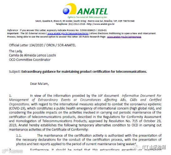 巴西ANATEL 3月初发布新公文No.134/2020/ORCN/SOR-ANATEL,公告决定在全球COVID-19疫情影响下,所有ANATEL当前需要续证的案件无须提供续证的当地测试,制造商需要申明产品及相关零部件没有任何变更。此次非常规续证流程针对有效期至2020年6月30日的ANATEL COC证书。