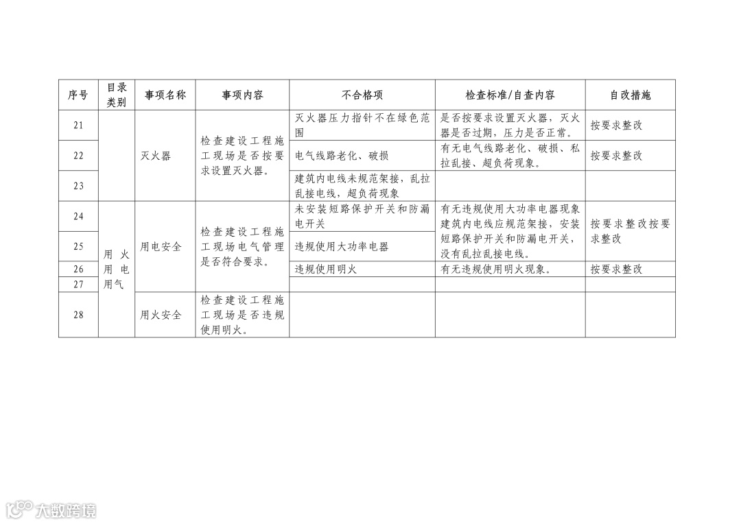 1.临时消防给水系统:是否按要求设置灭火器,灭火器是否过期,压力是否正常是否按要求设置灭火器,灭火器是否过期,压力是否正常。