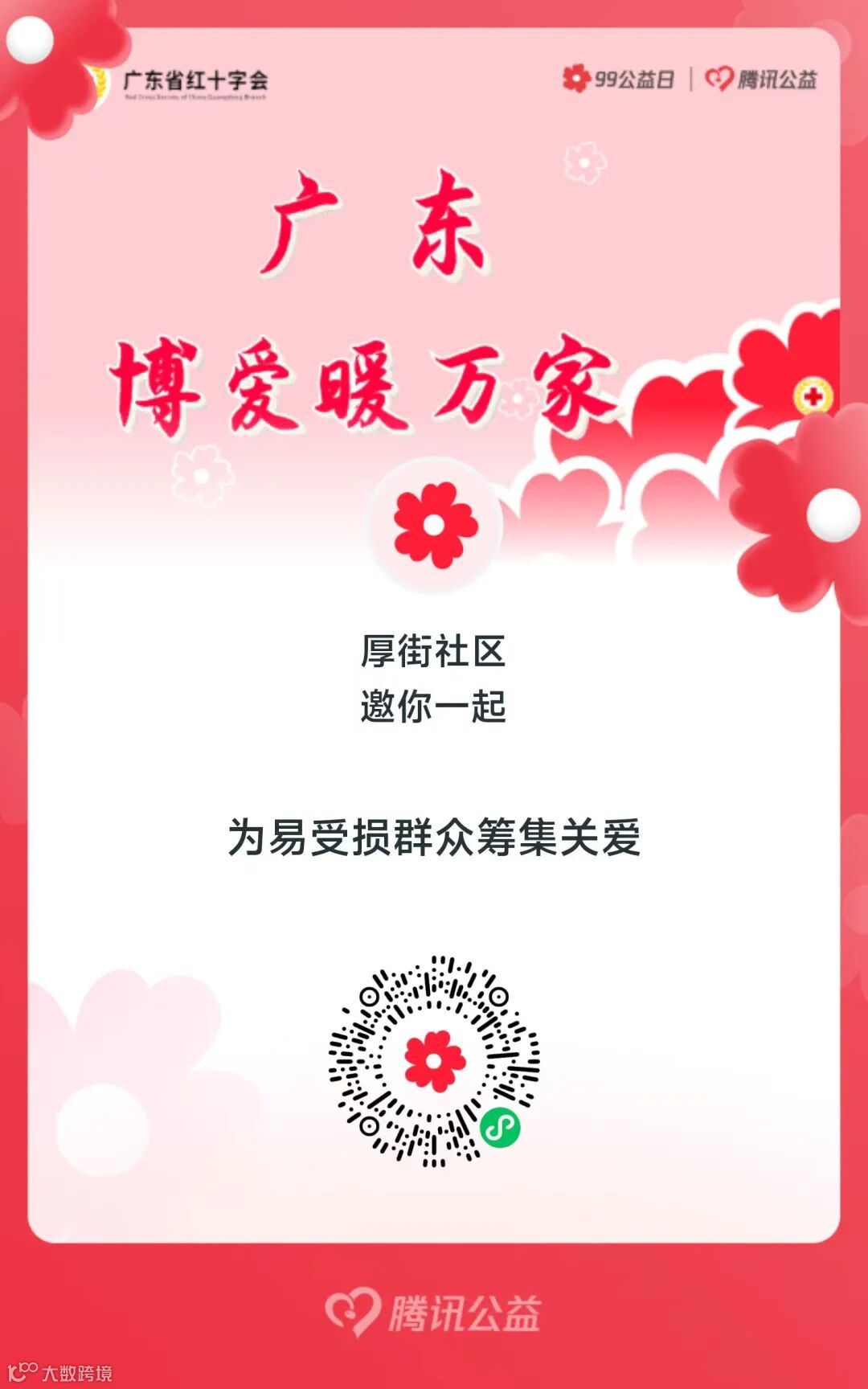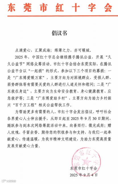 为帮助更多有需要的人,市红十字会发出倡议,呼吁社会各界爱心人士伸出援手,从即日起至2025年9月30日期间,用手机微信扫描腾讯公益海报二维码,即可参加本次厚街社区“一起捐”小队的“广东博爱暖万家”募捐活动。