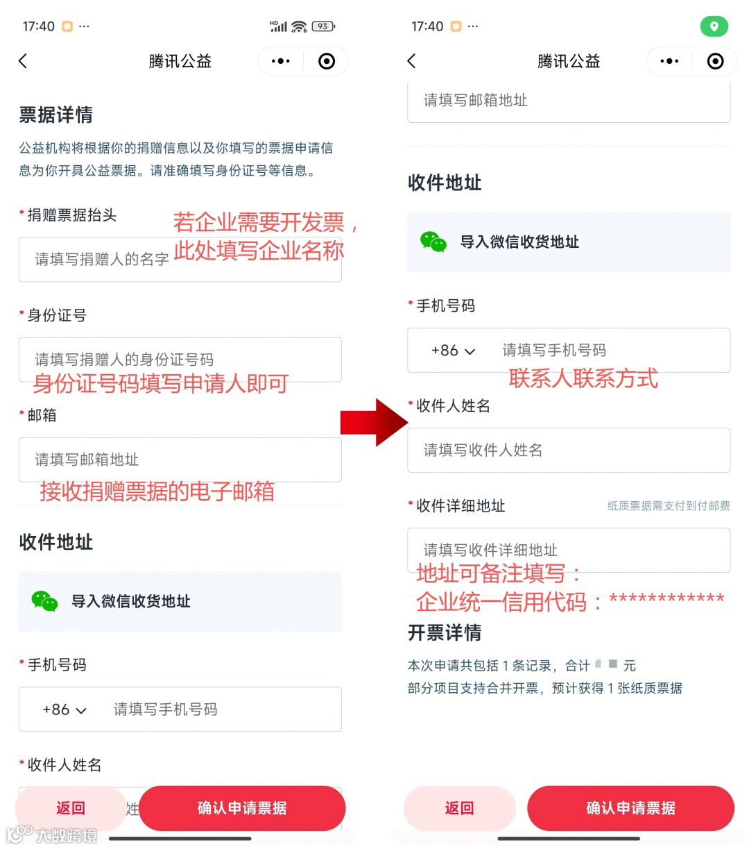 若需开具捐赠票据,请进入“腾讯公益”小程序首页→点击“我的”→点击“捐赠票据”一点击“待开票捐赠”→选择要开具票据的项目及金额→填写开票信息→等待机构审核后开具电子票据发送至手机或邮箱。(特别提醒:申请票据请在捐赠后2个月内进行操作,逾期将无法在腾讯公益小程序上申请,同一项目多个捐款人填写同一开票名称的,金额合计后统一开到一张票据。)