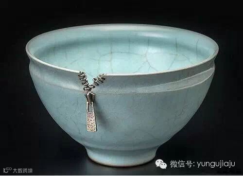另外,除了基本的修补,如何给这些获得新生的器物赋予新的意义,则是更深的学问。“若是简单地修复,那是匠活,修复了还有新的观赏把玩价值,这才是艺术。每一只破损的物件到了手上,都要仔细琢磨一番,如何进行巧妙修补,再创作。一只瓷杯的杯口外缘崩掉了,打了一张荷叶状的铜片将之包裹住,然后在杯底的裂缝交叉处打上一枚鱼形的铜钉,倒上茶水,“鱼”仿佛在水中游弋,而杯口上的“荷叶”与之呼应,意趣盎然。