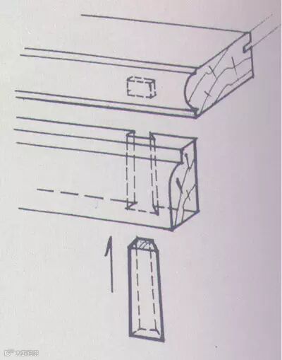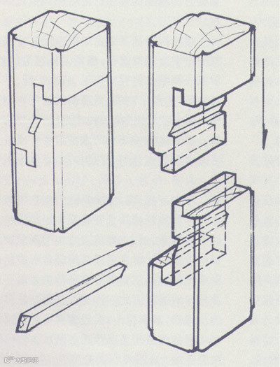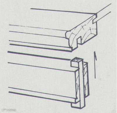 是在两顺向木材之间凿眼垂直栽上的薄方木片,以联结固定二者间的位置。如在桌面心板之间,床牙板与大边之间等等。