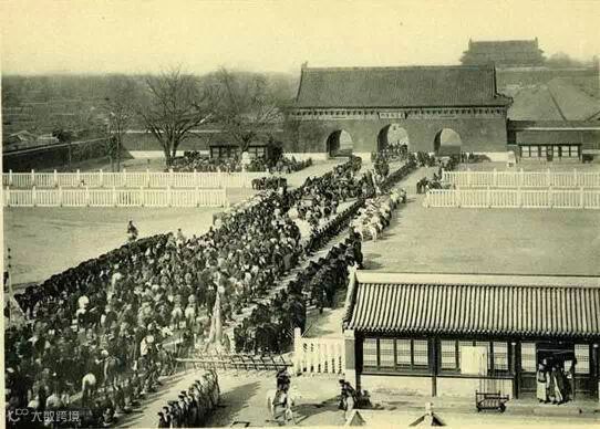 大清门迎銮,应该是1901年慈禧、光绪自西安回銮时进大清门时的情景,远处是天安门。