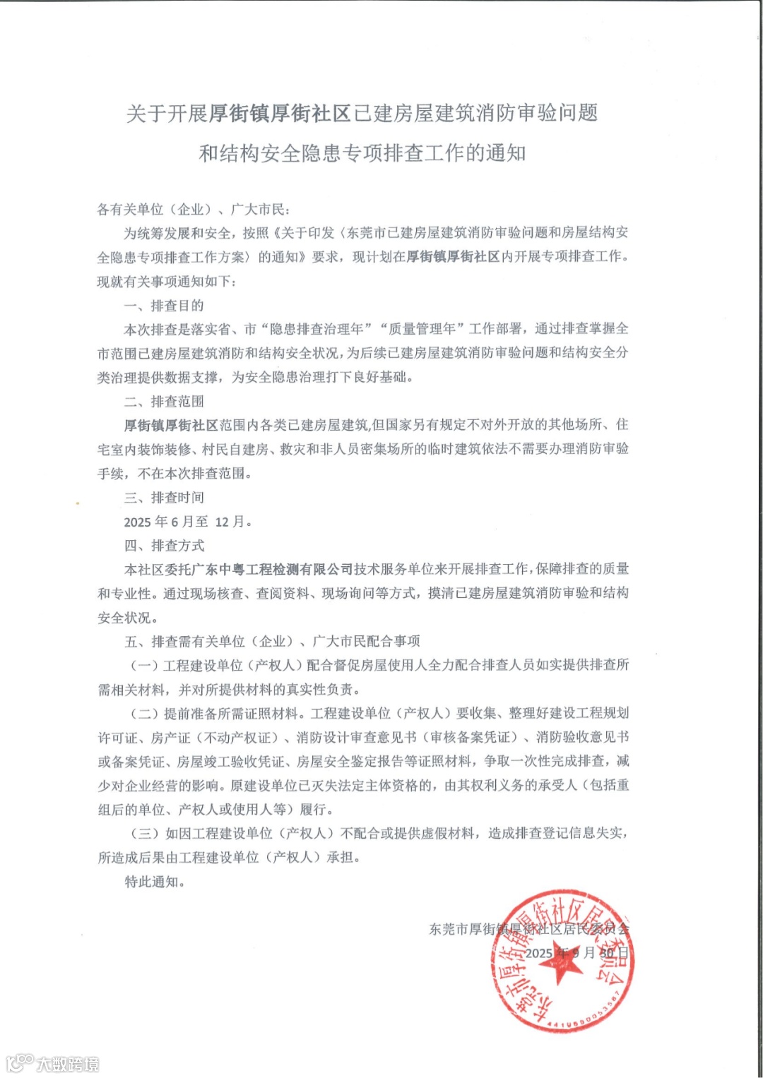 为统筹发展和安全,按照《关于印发〈东莞市已建房屋建筑消防审验问题和房屋结构安全隐患专项排查工作方案〉的通知》要求,现计划在厚街镇厚街社区内开展专项排查工作。现就有关事项通知如下: