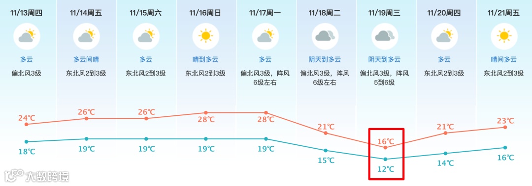 17—20日受强冷空气影响,阴天到多云为主,气温明显下降,19日当天最高温仅16℃,最低温降至12℃,最高温猛降12℃;