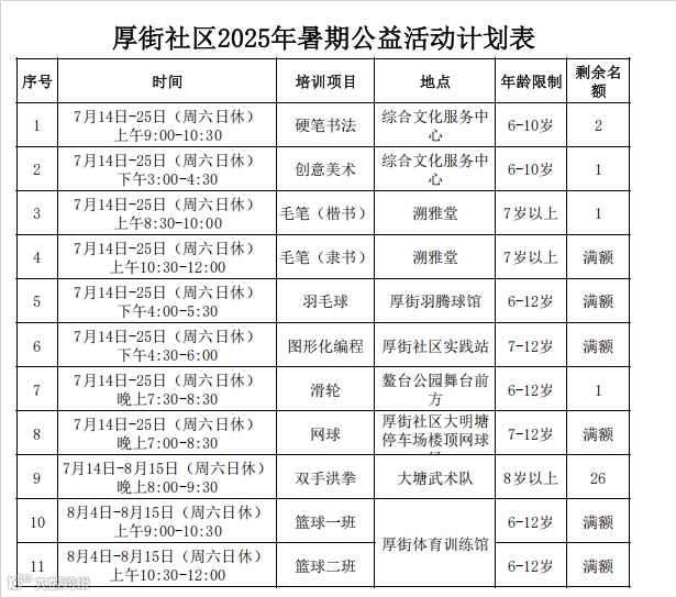 4、由于天气炎热,请参加培训的孩子自备用水,防止中暑。社区仅提供培训服务,请孩子监护人对孩子的安全负责。