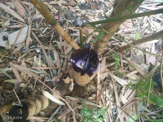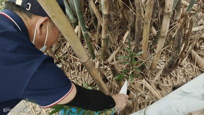 (四)使用刀将竹筒劈开十字槽,或者用细沙填满可能积水的竹筒。