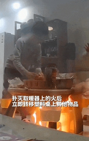 扑灭取暖器上的火后,又将塑料桌上的物品转移,阻止火灾进一步扩散。
