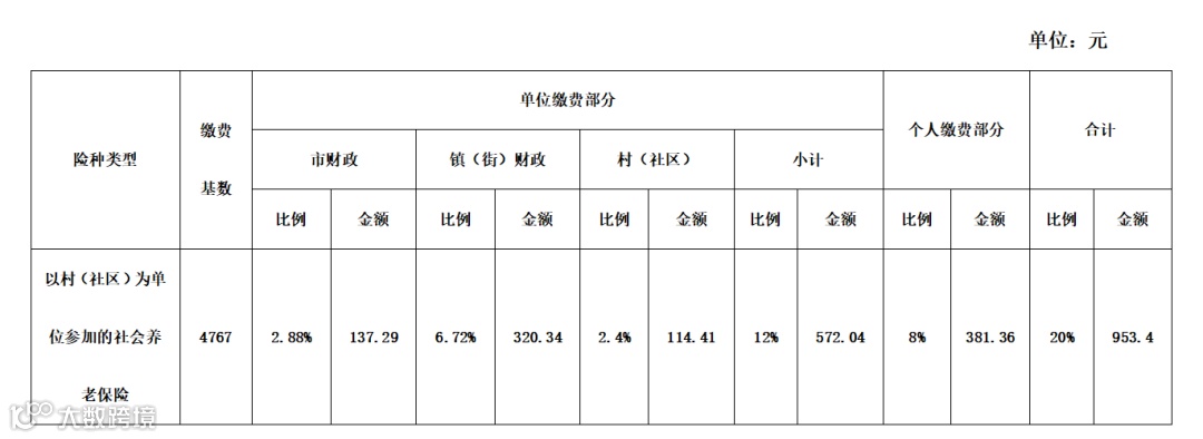 根据《关于公布2023年全省口径城镇单位就业人员月平均工资和2024年职工基本养老保险缴费基数上下限有关问题的通知》(粤人社发【2024】33号,附件1)文件精神,2024年7月1日起,以村(社区)为单位参加的社会养老保险缴费基数按4767元确定,以村(社区)为单位参加的社会养老保险2024年社保年度具体缴费明细见下表: