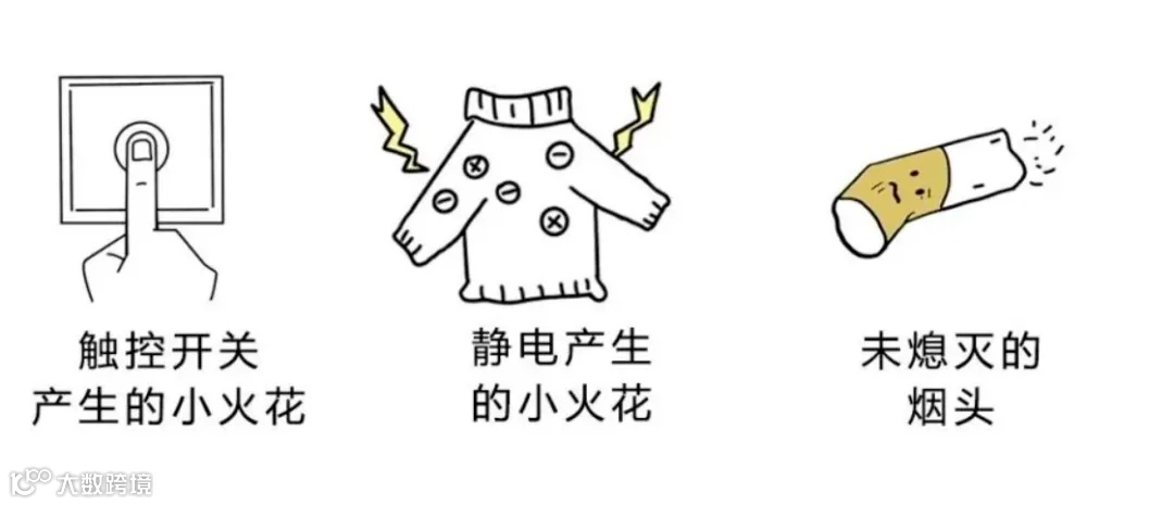 3.遇到引火源。当处于爆炸浓度范围内时,包括但不限于如下情形,都有可能引发爆炸。