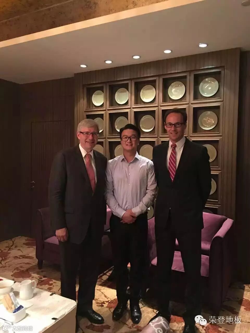 近日荣登地板CEO姚勇先生应邀参加了南京的一次聚会,在此期间就对本公司外贸出口及行业发展动态及方向做了交流,并与加拿大驻华大使Guy Saint-Jacques 及加拿大驻沪总领事 Weldon Epp拍照留念。
