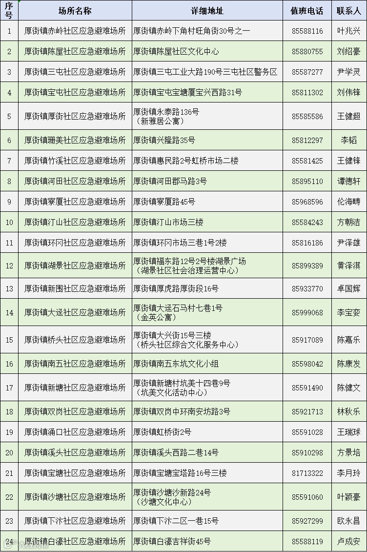厚街24个应急避难场所