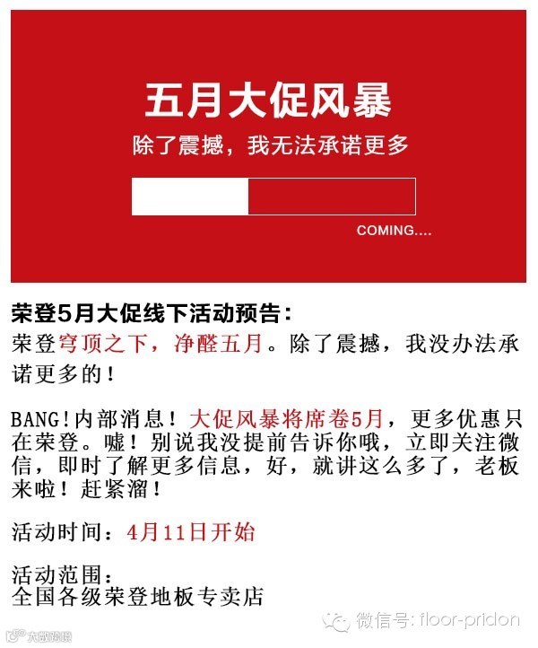 导读:荣登5月大促线下活动正在紧锣密鼓的准备中,时刻关注微信,了解更多活动详情。