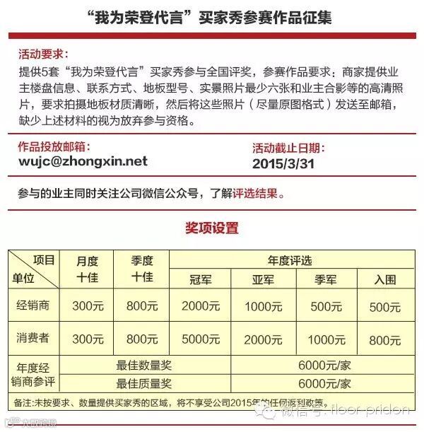尊敬的全国各地经销商们,2015年第一届“我为荣登代言”家装品牌活动马上要接近尾声了,手中的美图已经上传至我们的邮箱了吗?还没有上传的要抓紧哦,不要吝啬,好东西要大家分享。上次没及时收到通知的现在还可以参加哦,以下是活动内容,赶紧上传吧。