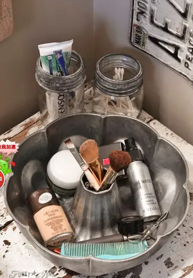 ▲拿个漂亮的大盆把东西装起来,省的本来就容易粘乎乎的瓶瓶罐罐再粘上一层灰然后粘在盥洗台上