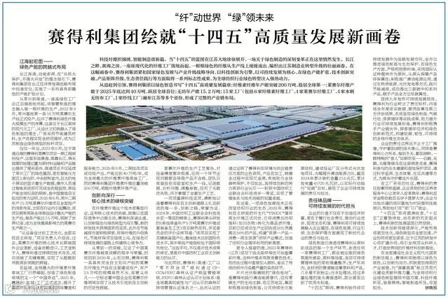 赛得利集团“十四五”期间在江苏地区的业务布局,带动区域产业链发展。赛得利紧扣绿色发展与产业升级战略,纤维素纤维、莱赛尔纤维产能均居全球首位。集团突破国外技术垄断,获行业科技奖,推出创新环保产品,践行清洁能源与社会责任。展望 “十五五”,将持续深化创新,助力全球纺织行业绿色转型。