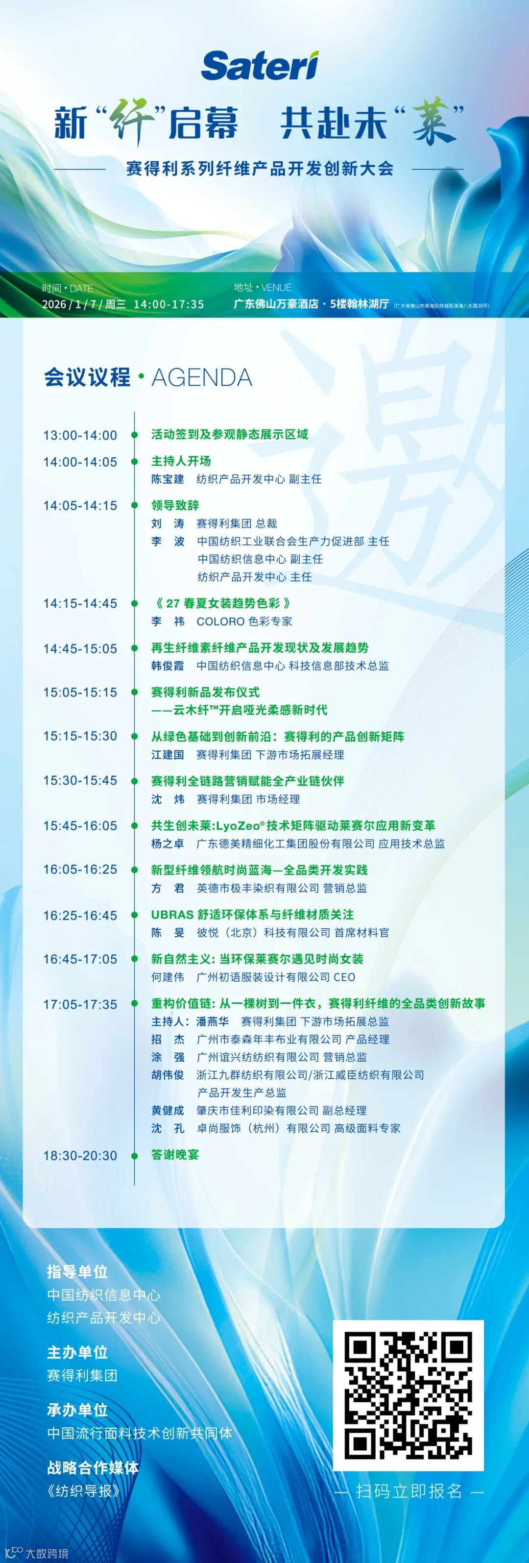 2026年1月7日,赛得利系列纤维产品开发创新大会将于广东佛山举办。本次大会将以“新‘纤’启幕·共赴未‘莱’”为主题,探讨再生纤维素纤维在产品开发与应用拓展的新思路、新方向,并面向全纺织产业集群隆重发布赛得利全新产品 —— 云木纤™。