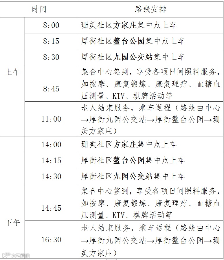 据介绍,目前,该“助老巴士专线”以厚街、珊美社区为试点,每周一至周五(国家法定节假日除外)早上8时,在珊美社区方家庄发车,途经鳌台公园、九园公交站,陆续接上有日间照料服务需求的老人到养老中心享受半天或全天日间托管服务,日托服务结束后从中心发车将老人送回试点社区对应站点。