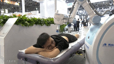 据遨博智能公司工作人员介绍,这是公司按照客户的要求定制的一款产品,配备了亲肤的末端工具,通过3D结构光视觉扫描,对人体穴位和疼痛部位进行精准的区域路径规划,利用声波作用在筋膜层使肌肉放松,并且机器人以16次/秒的速度高速运转,这是人工按摩所无法比拟的。