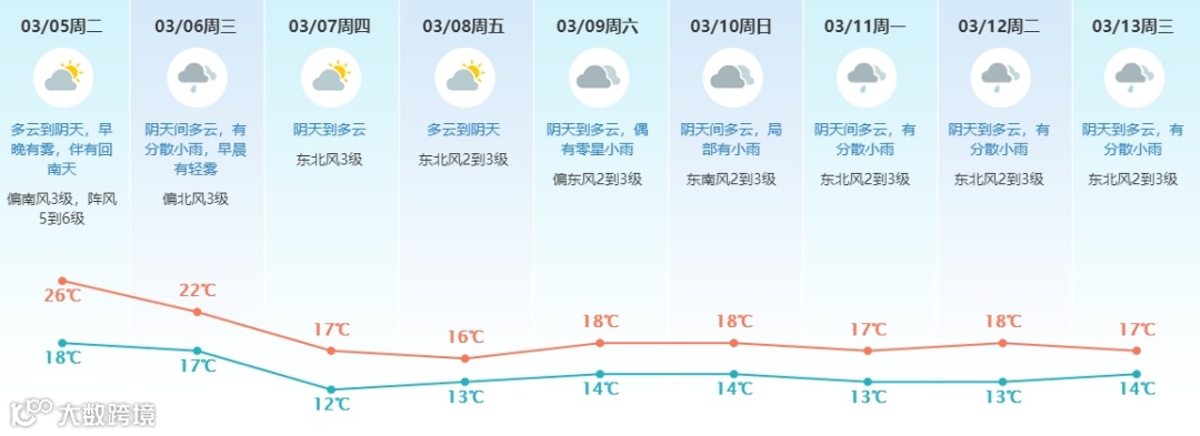 展望9-13日受冷空气补充影响,阴天间多云,有分散小雨。