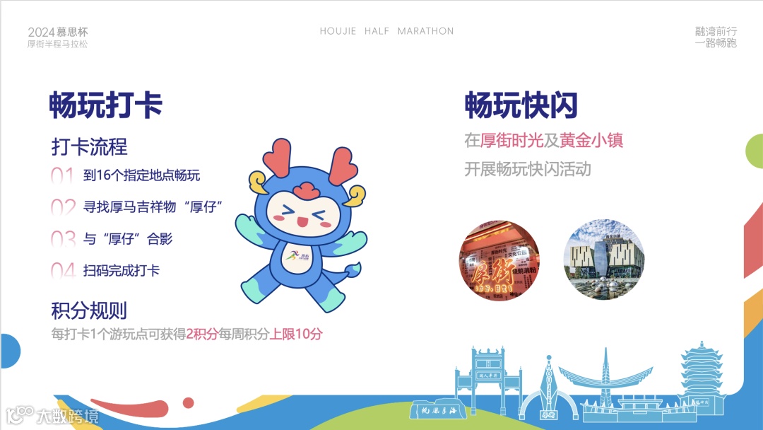 打卡流程:活动期间,前往游玩点,寻找打卡二维码及吉祥物“厚仔”,微信扫一扫或点击厚马小程序“扫码参与”按钮,现场扫描打卡二维码,根据提示完成打卡。
