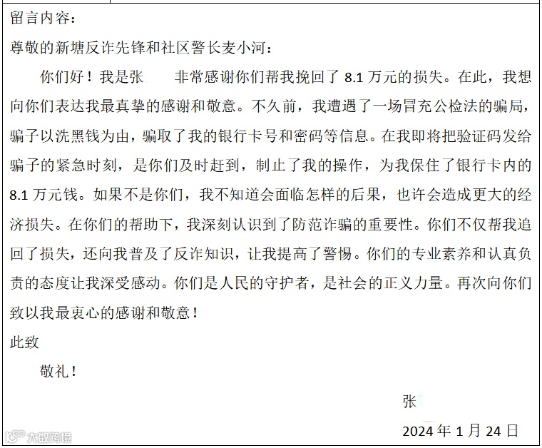 来信人对厚街公安表示感谢