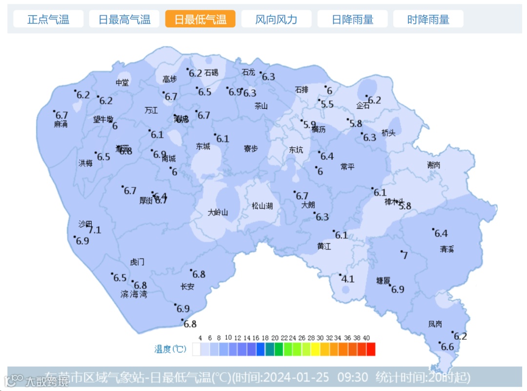 ▲截止今日9:30,东莞市区域气象站录得日最低气温