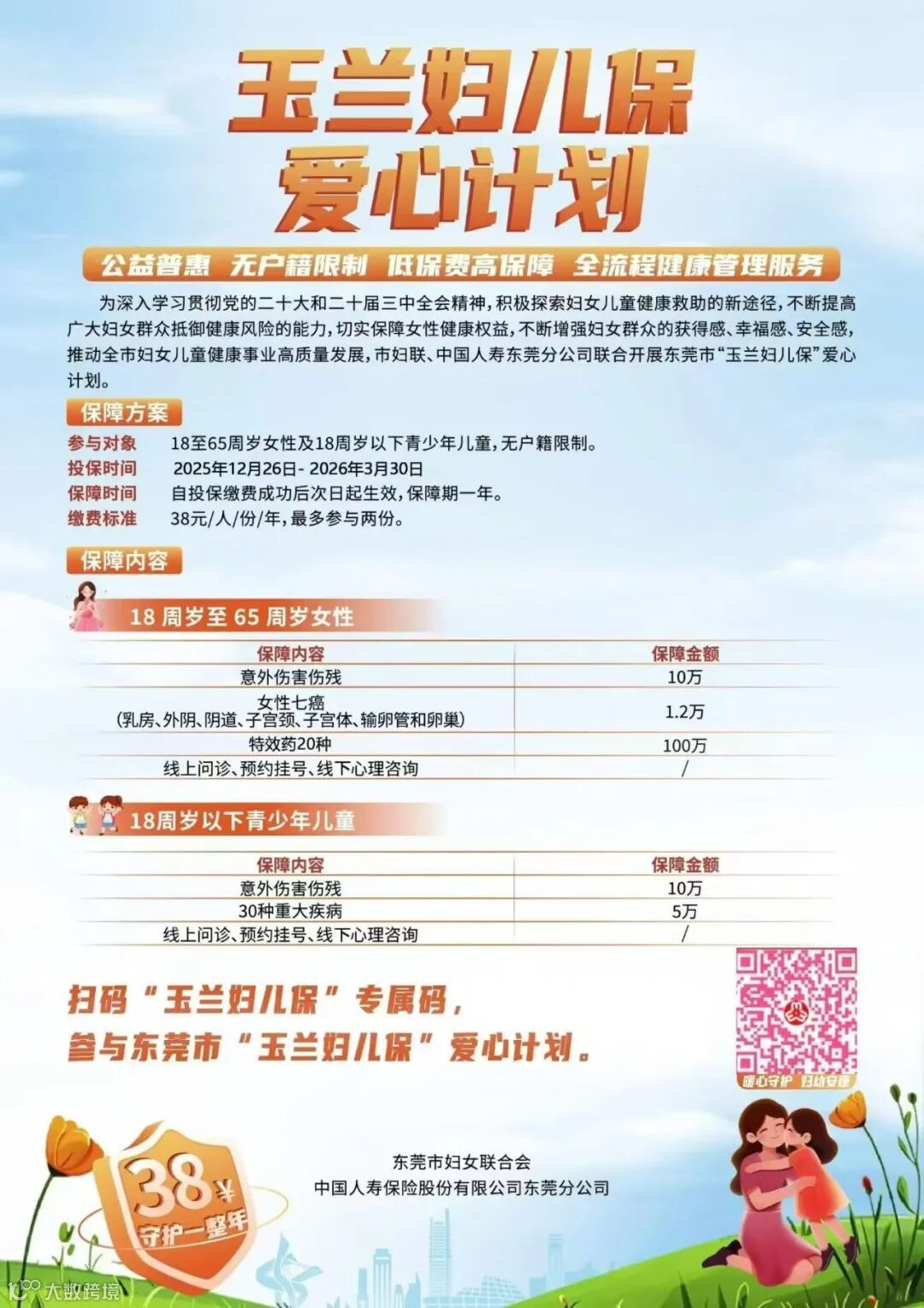 东莞市妇联、中国人寿东莞分公司联合开展东莞市“玉兰妇儿保”爱心计划,仅需38元,公益普惠不限户籍,低保费高保障,全流程健康管理服务,具体时间、地点安排如下: