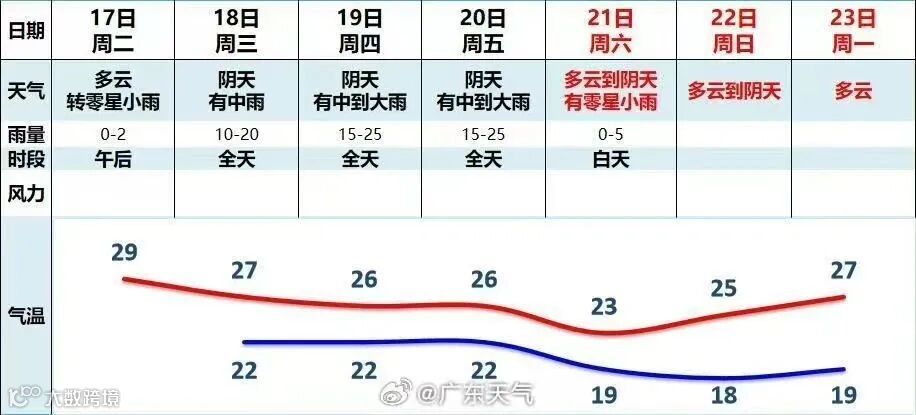 19日,粤西、珠江三角洲大部、韶关、清远市县有中到大雨局部暴雨,粤东市县多云到阴天有分散阵雨,其余市县阴天有阵雨局部大雨。