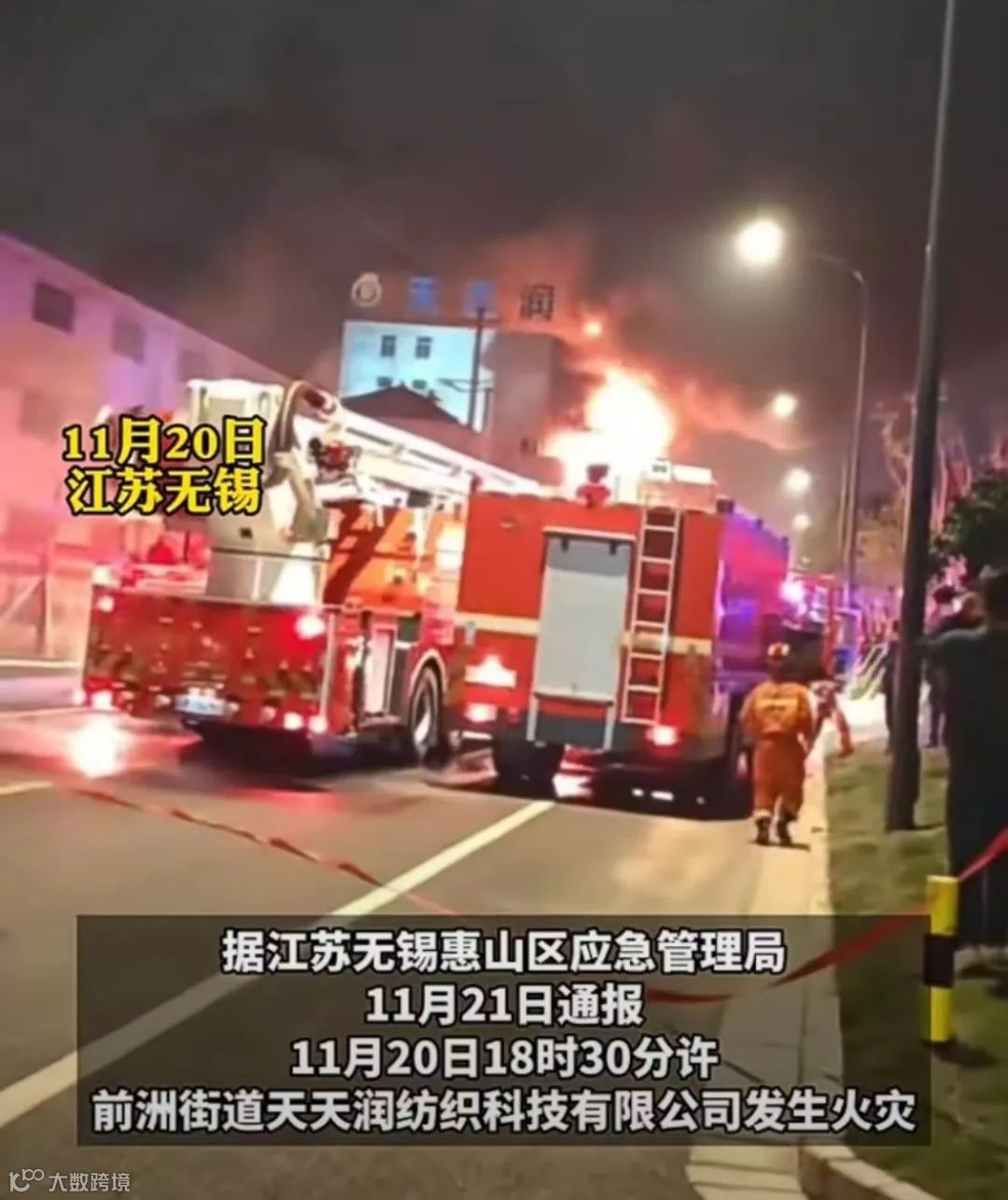 2023年11月20日18时30分许,江苏省无锡市惠山区前洲街道天天润纺织科技有限公司发生火灾,事故造成7人死亡。
