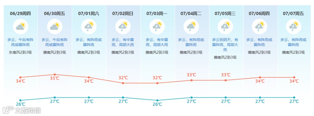 6月29-30日受副高影响,多云,天气高温炎热,午后有阵雨或雷阵雨;