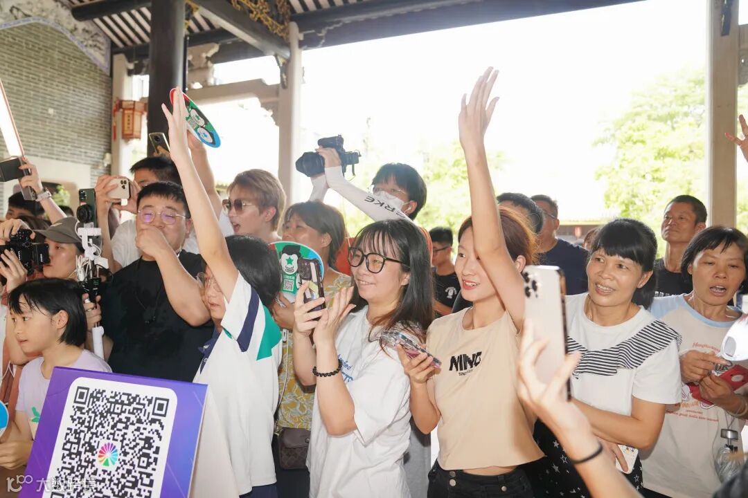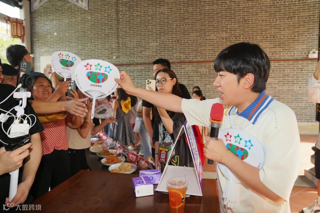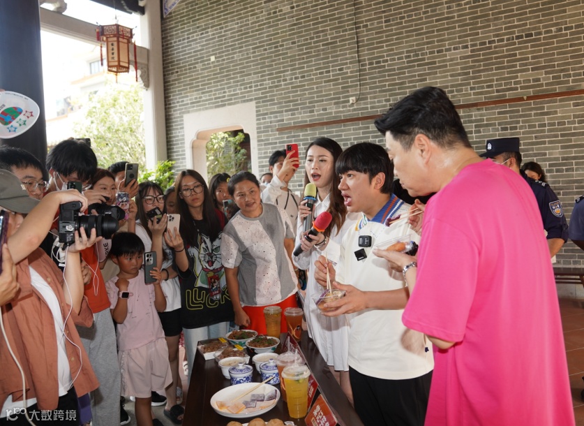 活动现场,王祖蓝和阮兆祥的到来,吸引了大批市民前来围观,二人一边品尝芋角、油糍等厚街美食,一边用粤语向现场及直播间观众推介。“现场有没有厚街男孩?有没有姓王的?”王祖蓝与现场观众频频互动,派发纪念品,并合影留念,气氛十分火热。