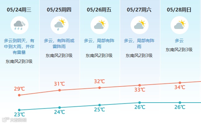24日受高空波动影响,多云到阴天,有中到大雨,并伴有雷暴;