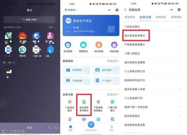 (1)微信小程序搜索“粤医保”,进入主界面后通过填写身份证号和人脸识别登录个人账号,在首页的业务办理模块中,选择“城乡居民参保登记”,小程序会自动跳转至资料填写界面(需检查首页左上角显示的地市为“东莞市”)