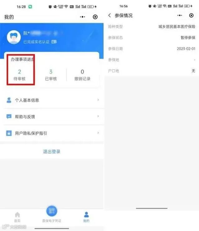 (3)资料提交后,由参保区划所属医保经办机构进行审核(审核期约为1-2个工作日),符合条件的审核通过;对登记信息填写不完整或有误的,审核不通过并提示参保人正确填写个人信息后重新提交。参保人可在“我的——待审核”中查询参保登记审核进度;医保分局审核通过后,参保人可在“首页——医保查询——参保情况”中查询个人参保状态。