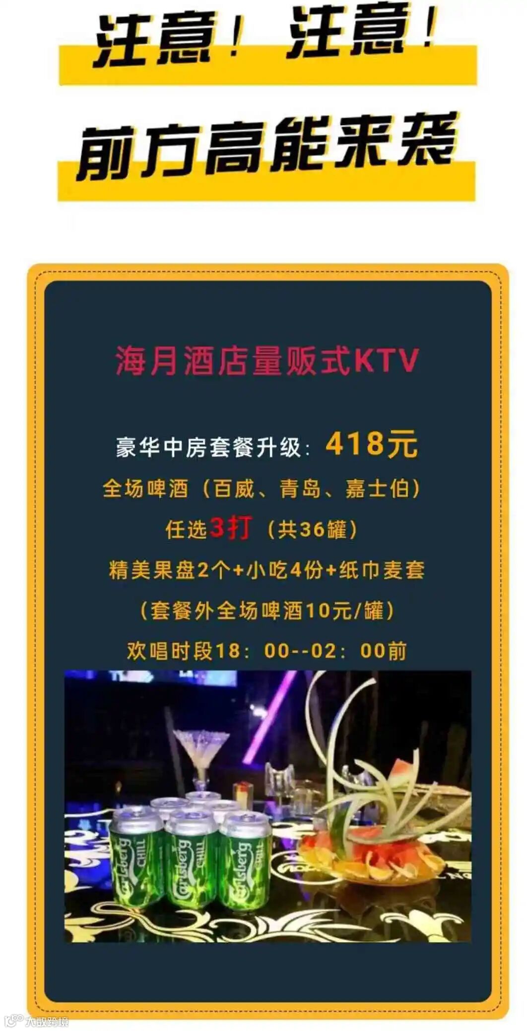 KTV中房418元,含三打(嘉士伯,百威,青岛任选)含小吃,果盘等。