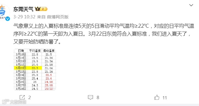 去年,东莞的入夏时间是3月22日