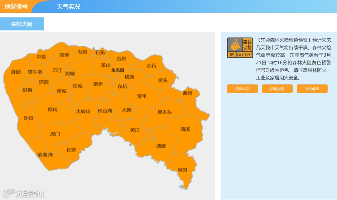 1、东莞市气象台于3月21日14时16分将森林火险黄色预警信号升级为橙色,请注意森林防火、工业及家居用火安全。