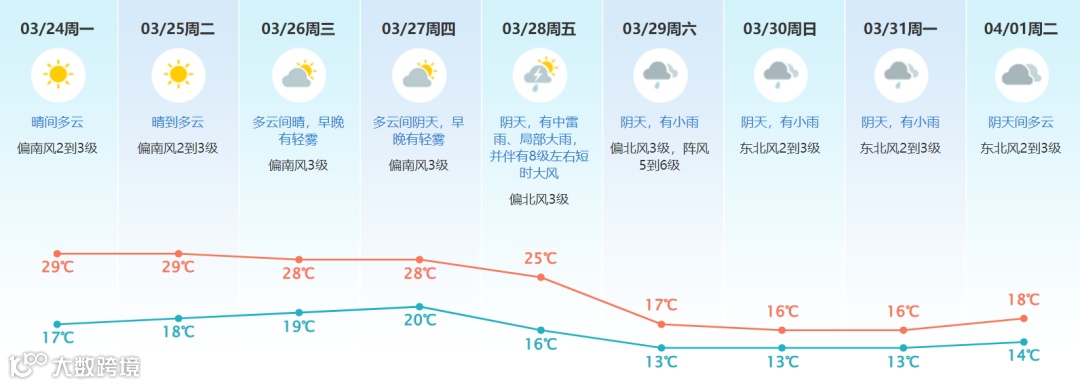 2、未来三天日温差大,29日起气温明显下降,请注意适时添减衣物;