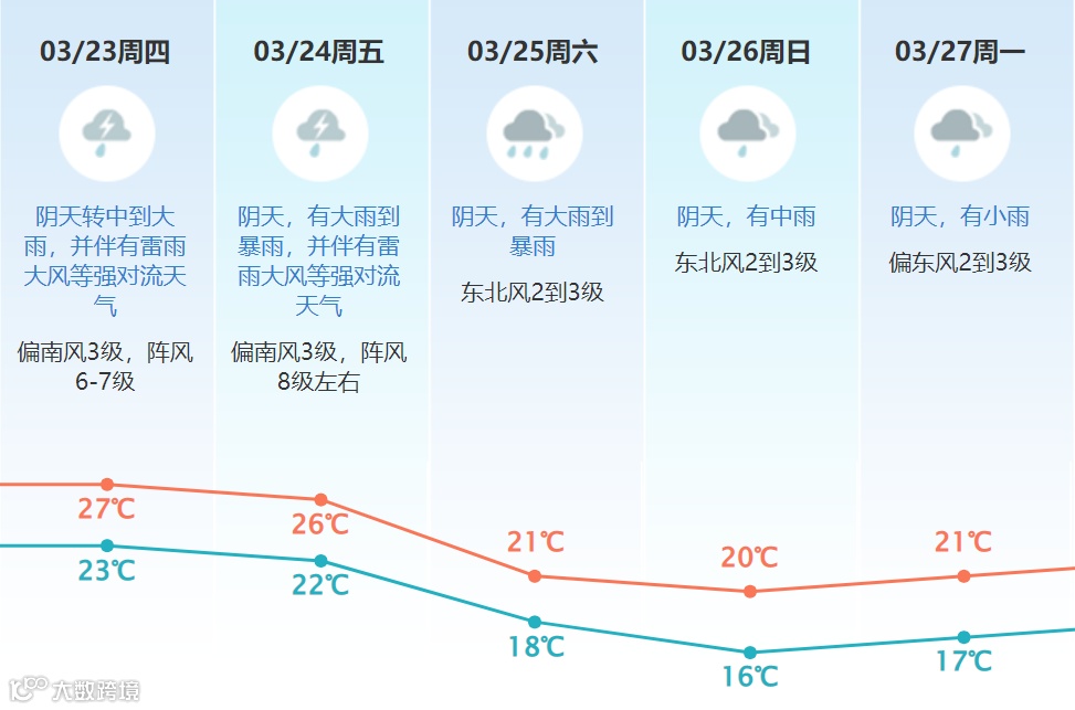 其中,23日阴天转中到大雨,并伴有短时强降水、雷雨大风等强对流天气,24-25日有大雨到暴雨,并伴有雷雨大风等强对流天气,气温下降;展望26-27日仍有中雨,日温差小,天气较清凉。